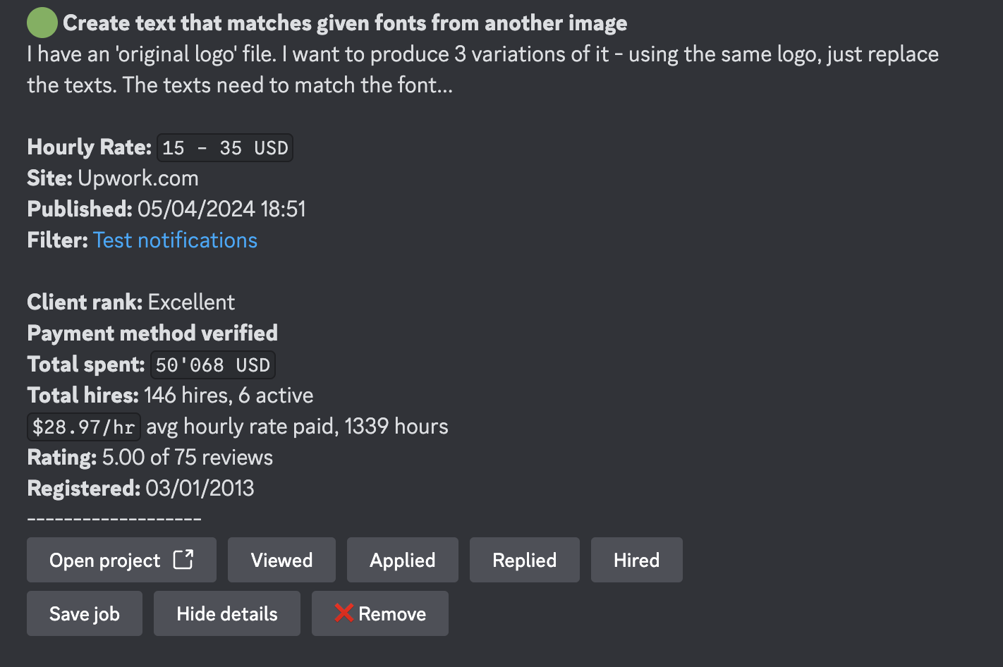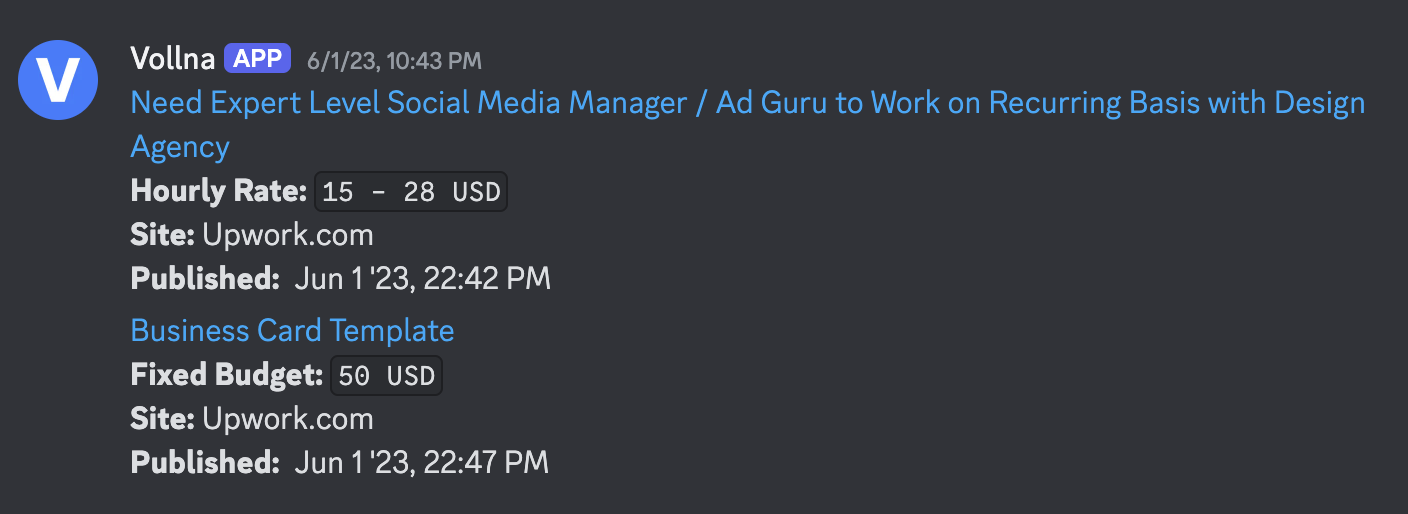 Provides a detailed summary of the job posting, including additional information such as short description, client rating, payment method verification and total spent. This option sends a separate notification for each new job posting.