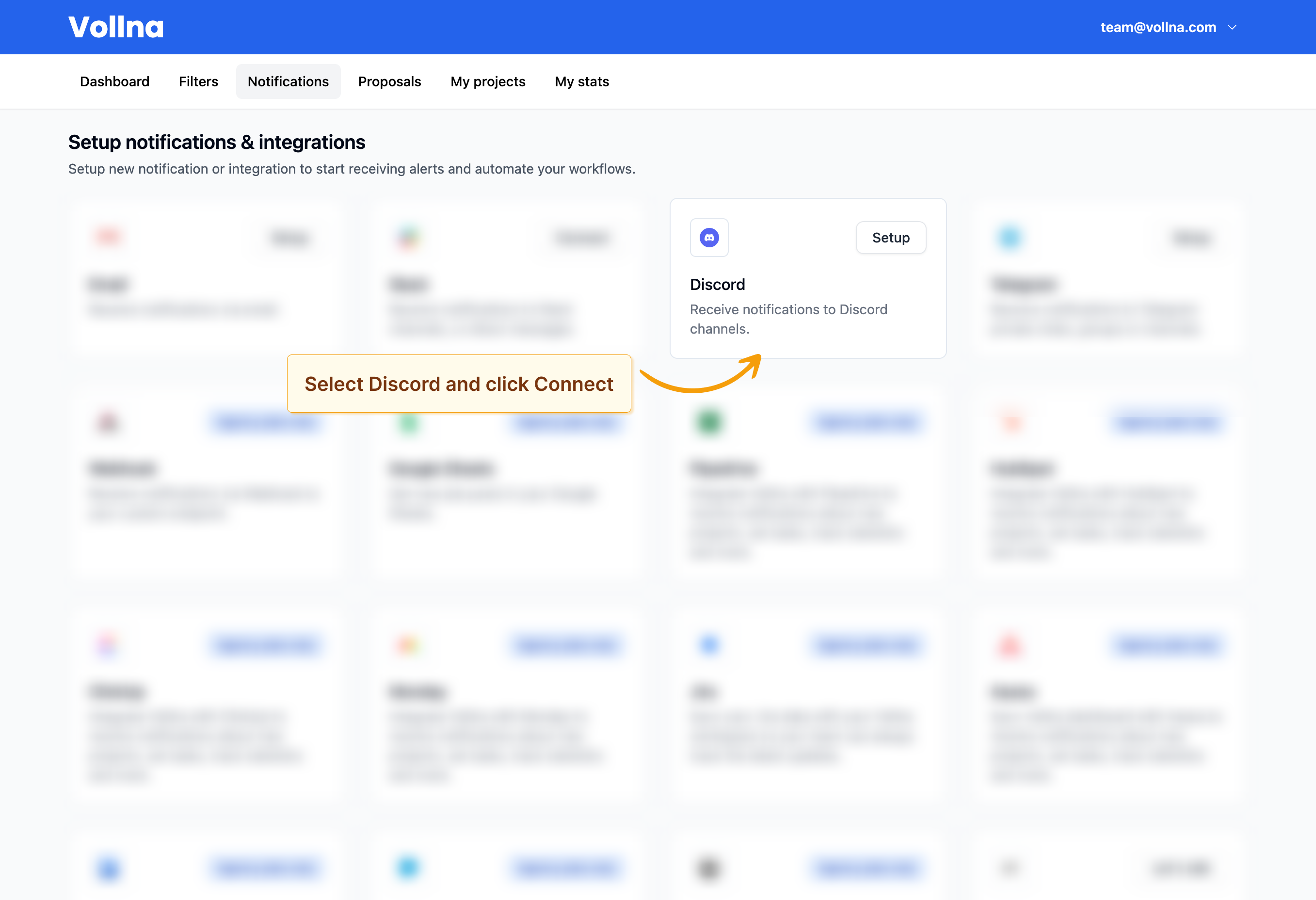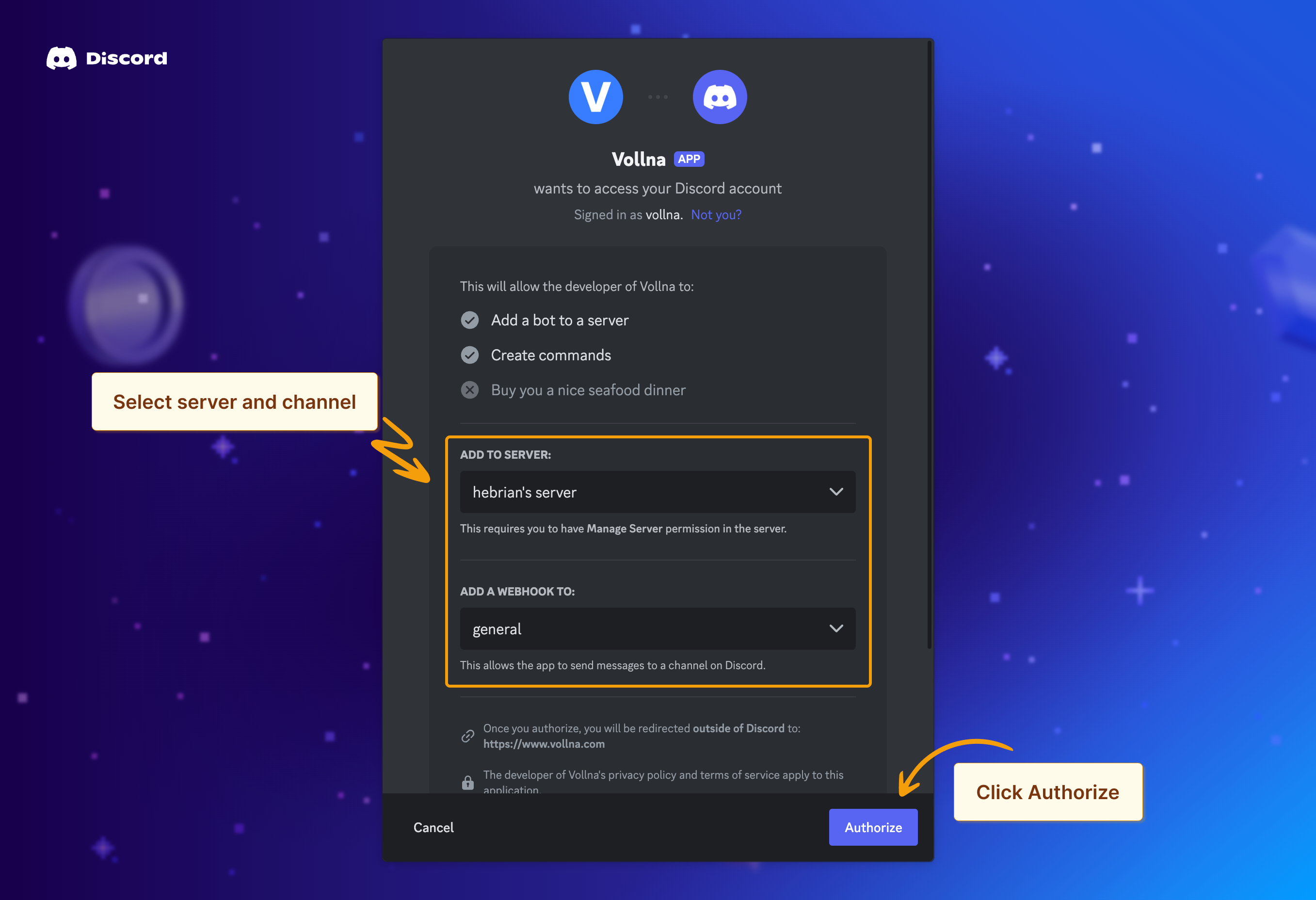 - Authorize the Vollna bot to connect to your Discord server and select the channel you want to receive notifications in.